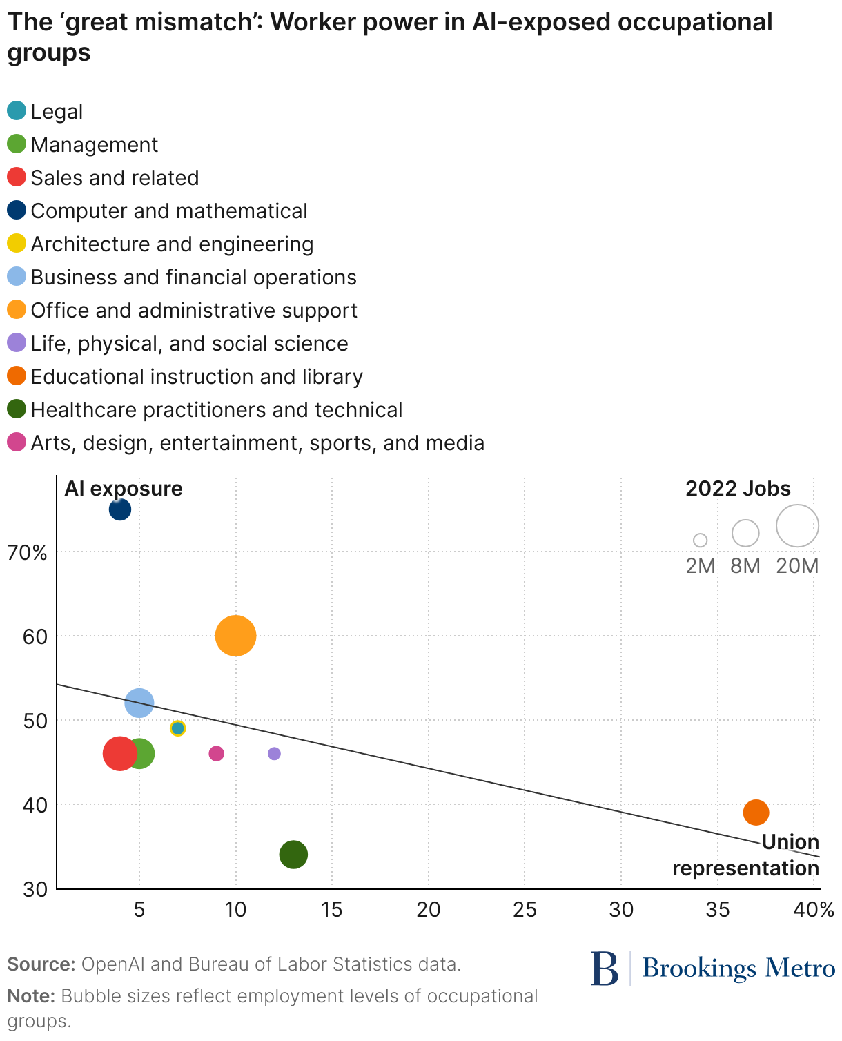 Second, worker organization and power (or lack thereof) remain critical to shaping how AI is deployed in the economy, yet they appear spotty and limited. While there have been a few high-profile examples of workers actively shaping AI safeguards through collective bargaining, such as last year’s landmark agreement between Hollywood writers and major studios, we find that there is a stark mismatch between the industries and occupations most exposed to generative AI and the sectors where workers have substantial union strength or other access to worker organizations, voice, and influence.