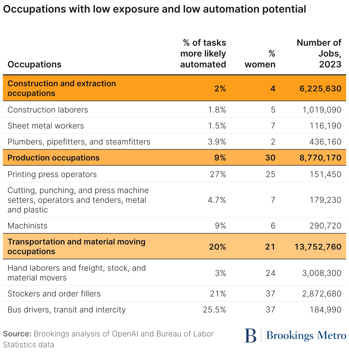 This reality runs counter to popular conceptions of technology and work: The dominant stereotype of a worker at high risk of automation is often that of a blue collar, male worker in manufacturing, warehousing, or truck driving, or perhaps a computer programmer. Yet generative AI is likely to have only a minimal impact on male-dominated blue collar industries, barring further advances in robotics technologies.