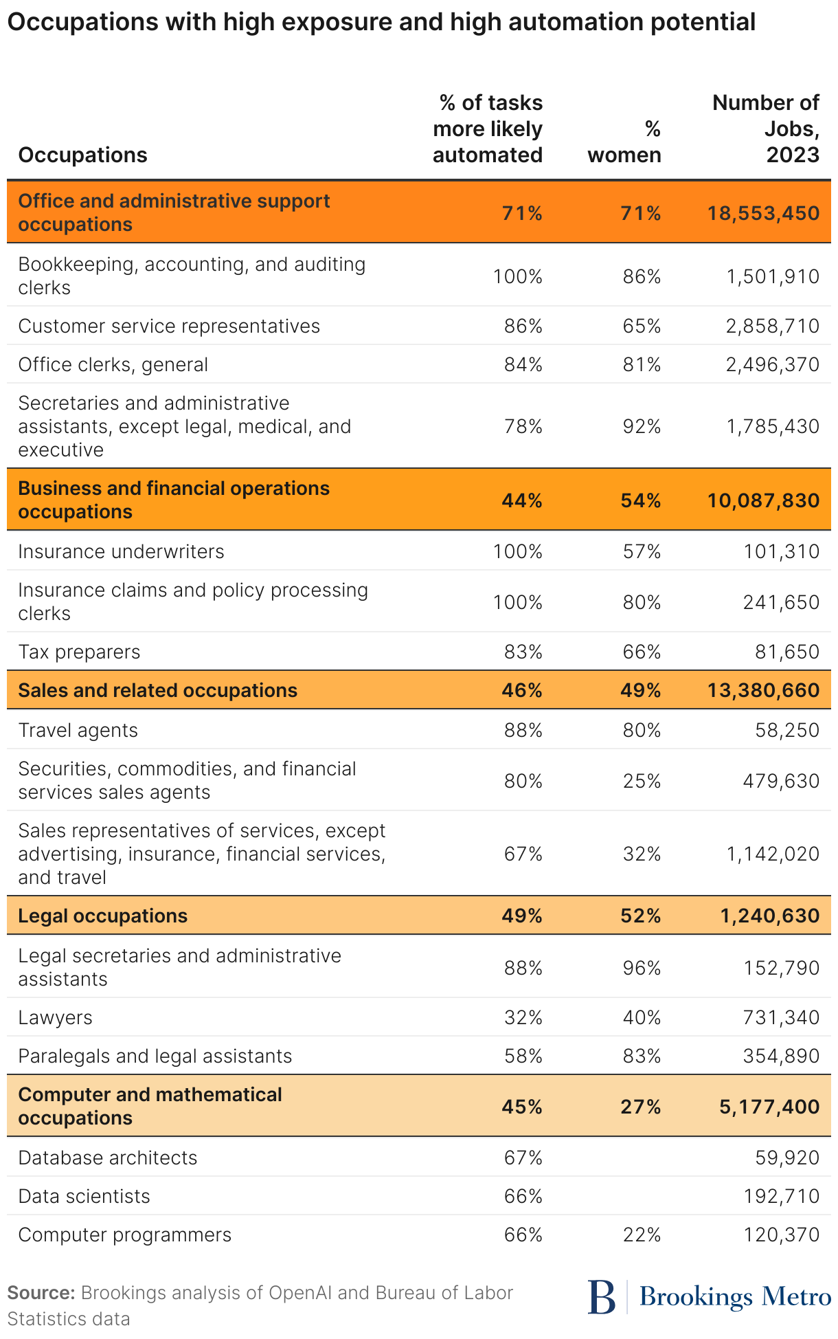 The plight of clerical workers illustrates a broader trend: It is women, not men, who face both the highest exposure to generative AI and the highest automation risk, due to their overrepresentation in white collar work that requires a college degree and in administrative support roles. Altogether, 36% of female workers are in occupations in which generative AI could save 50% of the time on tasks, compared to 25% of male workers, according to Brookings’ analysis of OpenAI’s GPT-4 ratings of task susceptibility.