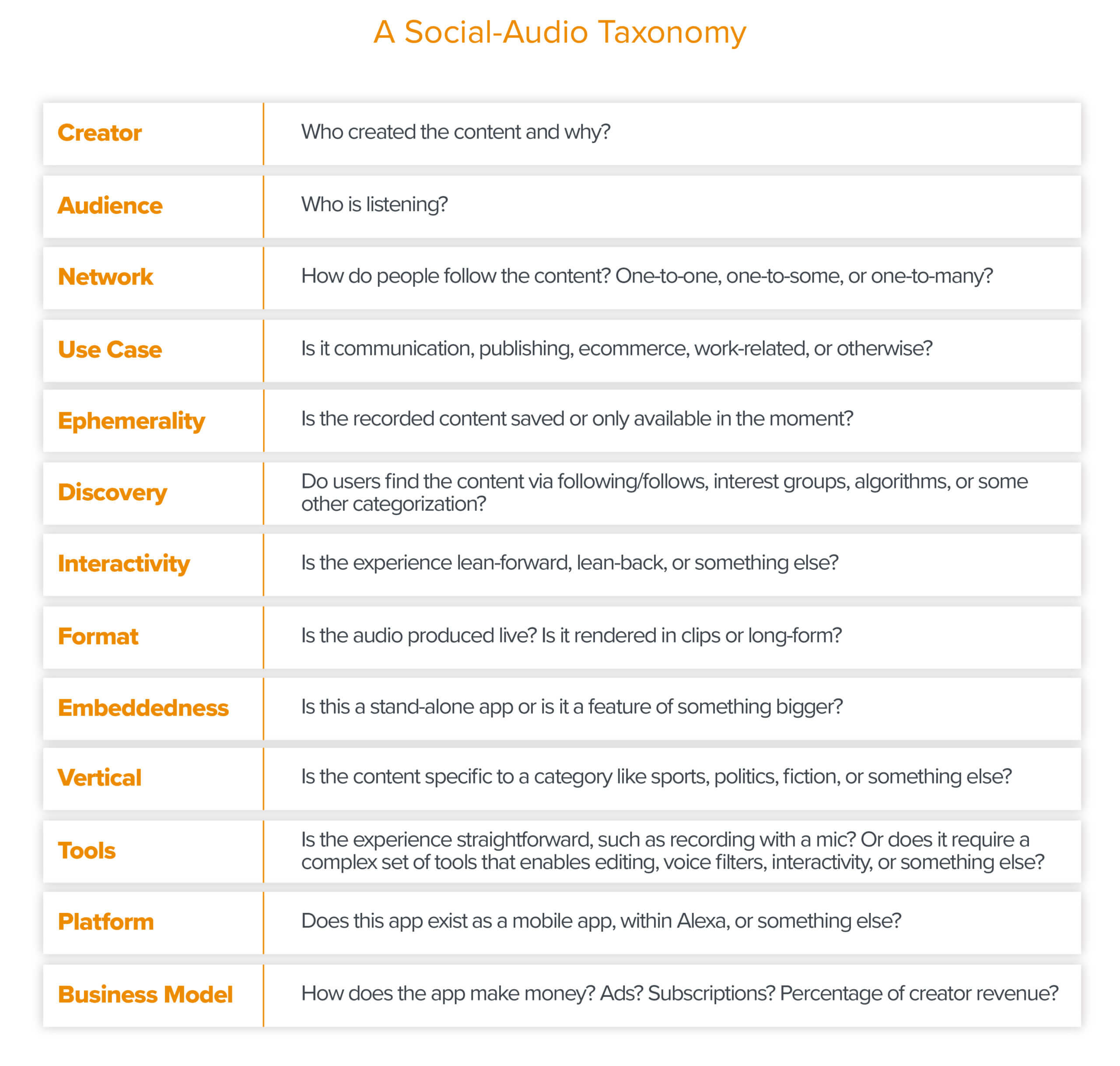 To see how future innovation might progress, it’s helpful to survey the current social-audio product landscape in abstract and break down some of the defining attributes. There are many existing audio use cases that can be categorized in various different ways.