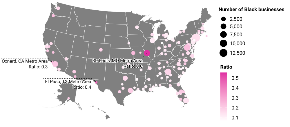 Perhaps a more relevant metric, however, is the ratio of Black businesses to the share the Black population. St. Louis also has highest representation of the Black population reflected in its share of Black businesses. The size of the metropolitan area’s dot is the number of Black businesses and the color of the dot in the map below is the percentage of the metropolitan area’s population that is Black divided by the percentage of businesses that are Black-owned. Therefore, if Black businesses were representative of their population, the ratio would equal 1.0. St. Louis has the highest ratio (0.56), demonstrating that while it is doing the best, it still has ample room to improve.