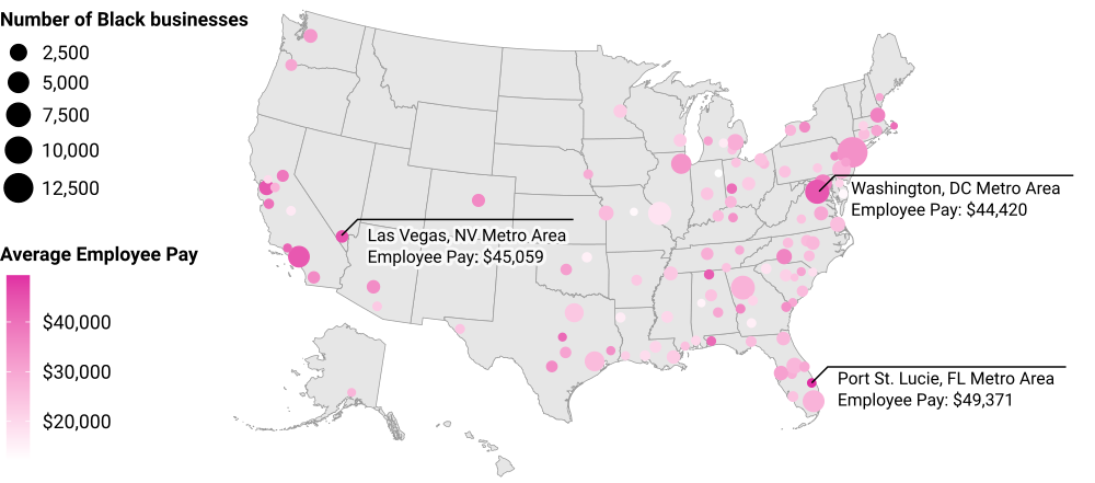 In the map below, the size of the metropolitan area’s dot is the number of Black businesses and the color of the dot represents that metropolitan area’s Black business average employee pay.